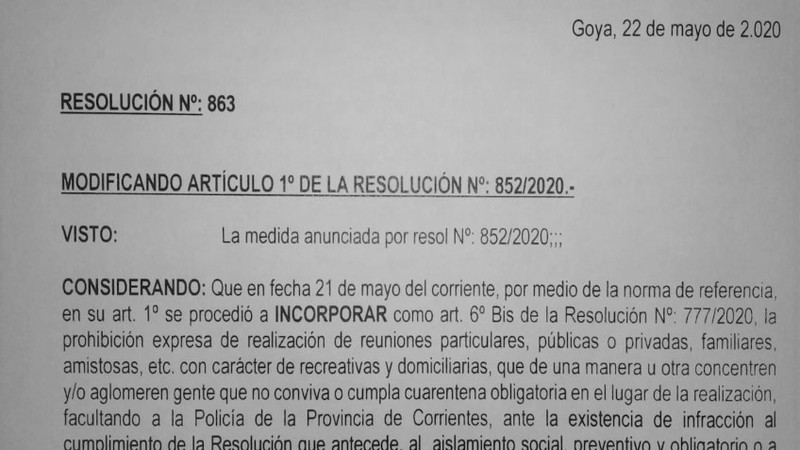 CONSIDERANDO: Que en fecha 21 de mayo del corriente, por medio de la norma de referencia, en su art. 1º se procedió a INCORPORAR como art. 6º Bis de la Resolución Nº: 777/2020, la prohibición expresa de realización de reuniones particulares, públicas o privadas, familiares, amistosas, etc. con carácter de recreativas y domiciliarias, que de una manera u otra concentren y/o aglomeren gente que no conviva o cumpla cuarentena obligatoria en el lugar de la realización, facultando a la Policía de la Provincia de Corrientes, ante la existencia de infracción al cumplimiento de la Resolución que antecede, al aislamiento social, preventivo y obligatorio o a otras normas dispuestas para la protección de la salud pública en el marco de la emergencia sanitaria, a proceder de inmediato a hacer cesar la conducta infractora, dando actuación a la autoridad competente, en el marco de los artículos 205, 239 y concordantes del Código Penal.