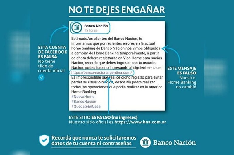 “Esta advertencia se realiza para alertar a los clientes sobre una información falsa que está circulando en la plataforma Facebook, donde se solicita un nuevo registro de los usuarios, en un enlace apócrifo”, apuntó el Nación en un comunicado. La institución bancaria aseguró que la plataforma está funcionando con total normalidad y que para realizar las operaciones bancarias habituales sus clientes deberán proceder con los pasos que ya se encuentran establecidos, sin modificar usuario ni clave personal. Además se les recordó a los clientes que la solicitud de claves personales, datos o usuarios no es algo que se realice a través de ningún medio, como un correo electrónico, mensaje de texto vía dispositivo móvil, telefónicamente o a través de un enlace.
