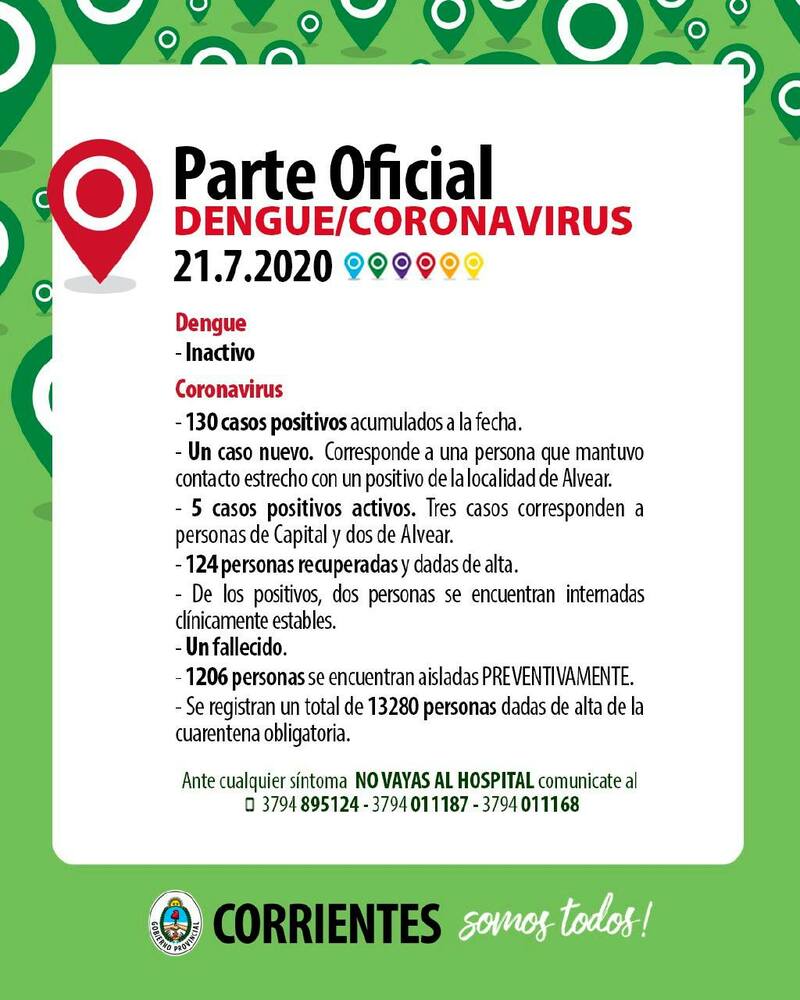 Un caso positivo nuevo, se trata de un residente de la localidad de Alvear que mantuvo contacto estrecho con un positivo anterior del lugar, se encuentra aislado y en buen estado de Salud.