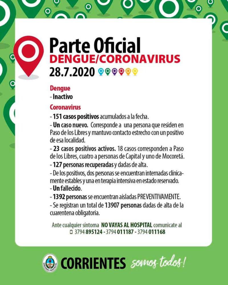 Hay 23 positivos activos de los cuales dos se encuentran internados en sala general en condición clínica estable. Otra persona se encuentra internada en la Unidad de Terapia Intensiva en condición clínica estable, todos en el Hospital de Campaña. Los otros activos se recuperan aislados en sus domicilios. Paso de los Libres tiene 18 casos activos, 4 Capital, y uno en Mocoretá, Alvear ya no tiene casos activos. A la fecha hay una persona fallecida en Capital. Hay dos sospechosos internados uno en la Unidad de Terapia Intensiva e estado reservado, y otra en sala general en condición clínica estable. Se encuentran en aislamiento preventivo obligatorio 1392 personas y han concluido esa condición a la fecha 13907 personas.
