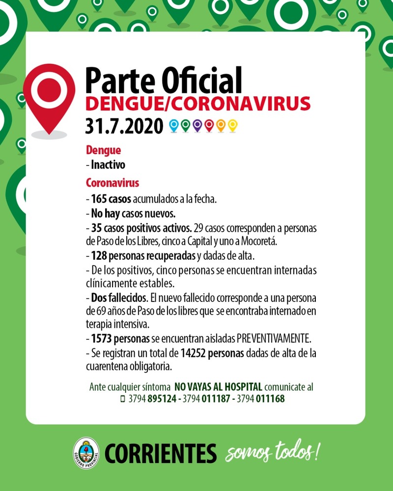 Hay 35 positivos activos, de los cuales cinco se encuentran internados en sala general del Hospital de Campaña, en condición clínica estable, el resto se recupera aislados en sus domicilios. Capital tiene cinco casos activos, Mocoretá uno y Paso de los Libres veintinueve.