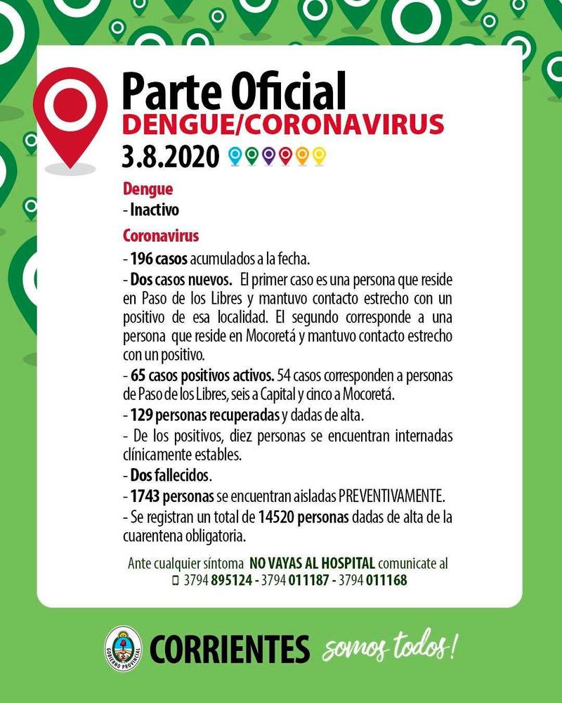 De esta manera se acumulan a la fecha 196 casos positivos, de los cuales se han recuperado 129 personas que fueron dadas de alta. Hay 65 activos de los cuales diez se encuentran internados en el Hospital de Campaña, todos en condición clínica estable, tres de Capital y siete de Paso de los Libres. Capital tiene seis casos activos, Mocoretá cinco y Paso de los Libres cincuenta y cuatro. Hay dos casos sospechosos internados en la sala de aislamiento del Hospital de Campaña, ambos se muestran en condición clínica estable. A la fecha hubo dos fallecidos, uno de Capital y uno de Libres. Están en aislamiento preventivo obligatorio 1743 personas y han concluido a la fecha la condición de aislamiento preventivo obligatorio 14520 personas.
