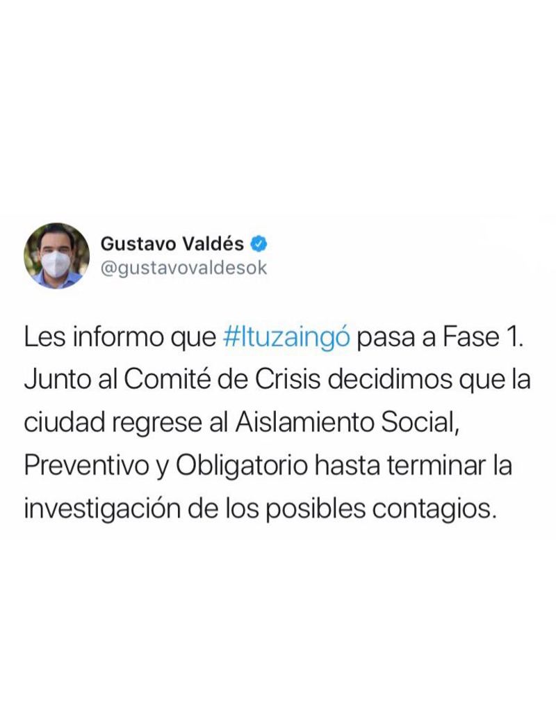 «Les informo que Ituzaingó pasa a Fase 1. Junto al Comité de Crisis decidimos que la ciudad regrese al Aislamiento Social, Preventivo y Obligatorio hasta terminar la investigación de los posibles contagios», twiteó el Mandatario este domingo a la tarde.
