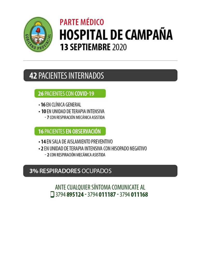 El Ministerio de Salud Pública, comunica el parte médico de los pacientes internados en el Hospital de Campaña Escuela Hogar.