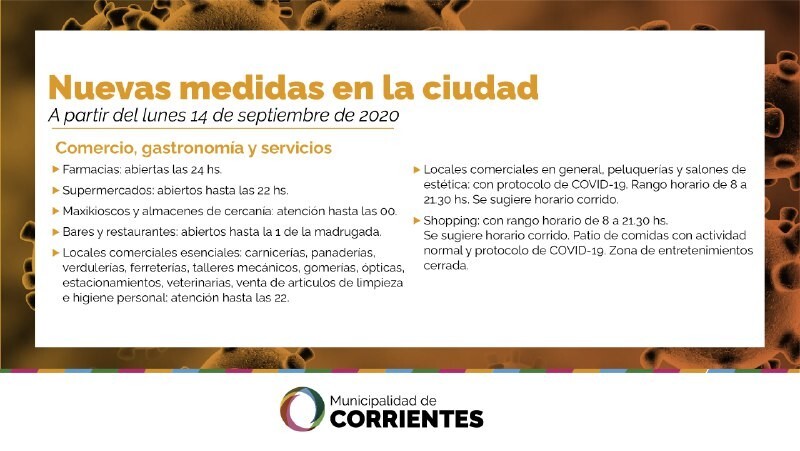 Los comercios en general podrán abrir de 8 a 21.30 (esto incluye las peluquerías y los salones de estética), con la sugerencia de que abran de corrido. En cuanto a los bares y restaurantes podrán abrir hasta la 1 de la madrugada; los supermercados y los locales comerciales esenciales (carnicerías, panaderías, verdulerías, ferreterías, talleres mecánicos, gomerías, ópticas, estacionamientos, veterinarias, venta de artículos de limpieza e higiene personal), hasta las 22; las farmacias, las 24 horas; los maxikioscos y los almacenes de cercanía, hasta la medianoche; y en cuanto al delivery, el servicio estará disponible hasta la 1 de la madrugada.