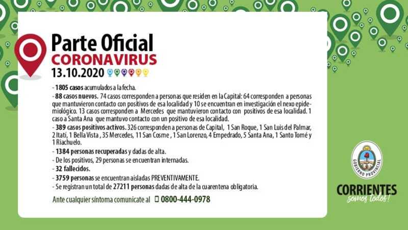 El Gobierno Provincial informó que en las últimas 24 horas se han registrado 88 contagios de Coronavirus, de los cuales 74 son residentes de Capital, 13 de Mercedes y 1 de Santa Ana, todos se encuentran aislados y cumpliendo el protocolo correspondiente.