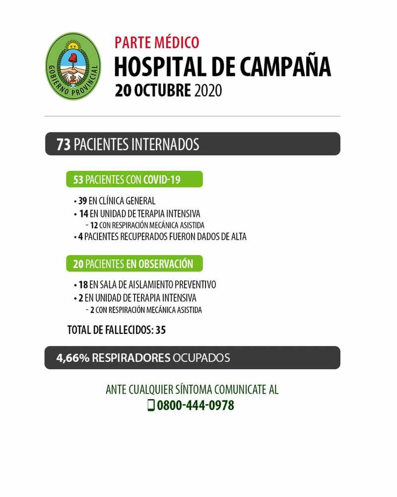 El Ministerio de Salud Pública, comunica el parte médico de los pacientes internados en el Hospital de Campaña Escuela Hogar.