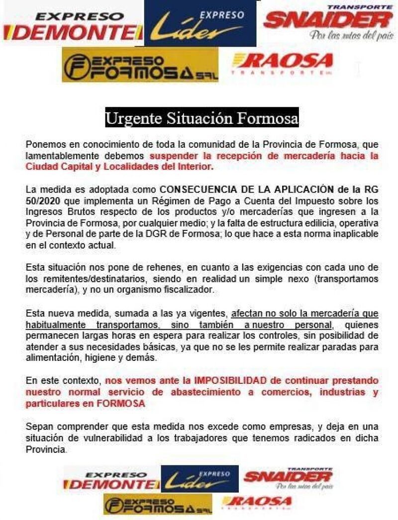 Las empresas Expreso Demonte, Expreso Líder, Transporte Snaider, Expreso Formosa y Transporte Raosa, informaron por medio de un comunicado que suspenderán sus servicios en la provincia de Formosa.