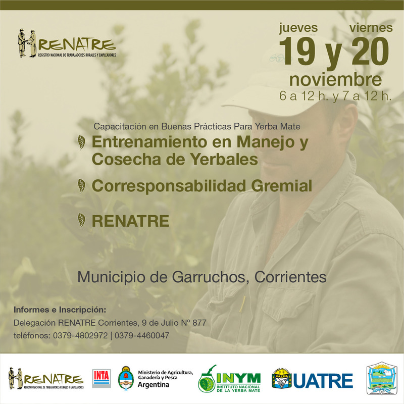 La Delegación del RENATRE (Registro Nacional de Trabajadores Rurales y Empleadores) en Corrientes lanzó un ciclo de capacitación presencial para el sector yerbatero tanto teórica como práctica del 19 al 26 de noviembre. Las capacitaciones fueron organizadas junto al Instituto Nacional de Tecnología Agropecuaria (INTA), al Instituto Nacional de Yerba Mate (INYM), a la Unión Argentina de Trabajadores Rurales y Estibadores (UATRE) y a las distintas municipalidades.