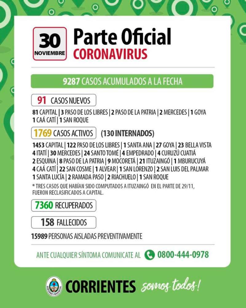 91 casos positivos nuevos, 81 de estas personas residen en Capital, el nexo de contagio provino de contacto estrecho con positivos locales, 3 de Paso de los Libres originado en contacto estrecho con un positivo de la localidad, 2 de Paso de la Patria provenientes de contacto estrecho con un positivo local, 1 de Goya proveniente de contacto estrecho con un positivo local, 1 de Caa Catí proveniente de contacto estrecho con un positivo de la localidad, 1 de San Roque proveniente de contacto estrecho con un positivo de la localidad y 2 de Mercedes originados en contacto estrecho con un positivo local. Todos se encuentran aislados y cumpliendo el protocolo correspondiente.