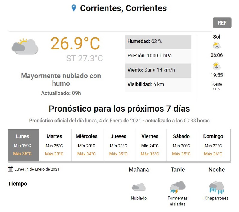 Para este Lunes 4 de Enero del 2021, el Pronóstico Meteorológico Nacional anuncia un día donde se podrían presentar tormentas aisladas por la tarde, y chaparrones por la noche. La temperatura mínima será de unos 19ª C y la máxima de 35ªC.