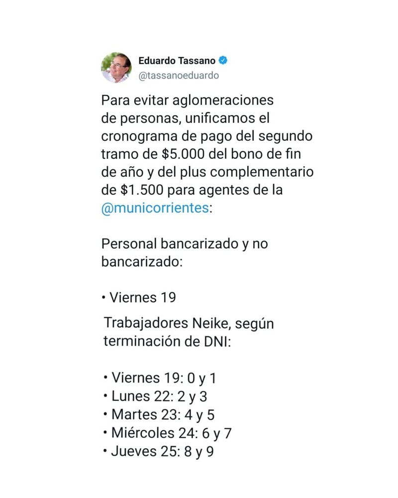 Este viernes 19 de febrero, la Municipalidad de Corrientes arrancará el cronograma de pago de los 5.000 pesos correspondientes a la segunda parte del bono de fin de año para todo el personal, el cual se pagará junto con el plus complementario de 1.500 pesos, según informó el intendente Eduardo Tassano a través de sus redes sociales.