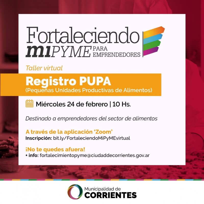 Este miércoles se desarrollará el tema Registro para Pequeñas Unidades Productivas de Alimentos (Pupa) y el viernes Ocupación del espacio público: trámites para solicitud de permiso. Los mismos se realizarán a través de la plataforma Zoom, estando abierta la inscripción en el link: https://bit.ly/FortaleciendoMiPyMEvirtual