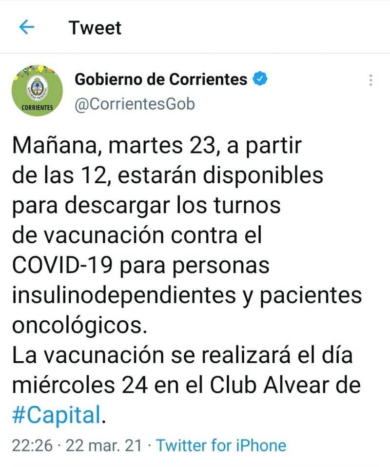 El Gobierno de Corrientes comunicó por medio de su cuenta oficial de Twitter que a partir de hoy -martes 23- desde las 12, estarán disponibles para descargar los turnos de vacunación contra el COVID-19 para personas insulinodependientes y pacientes oncológicos.