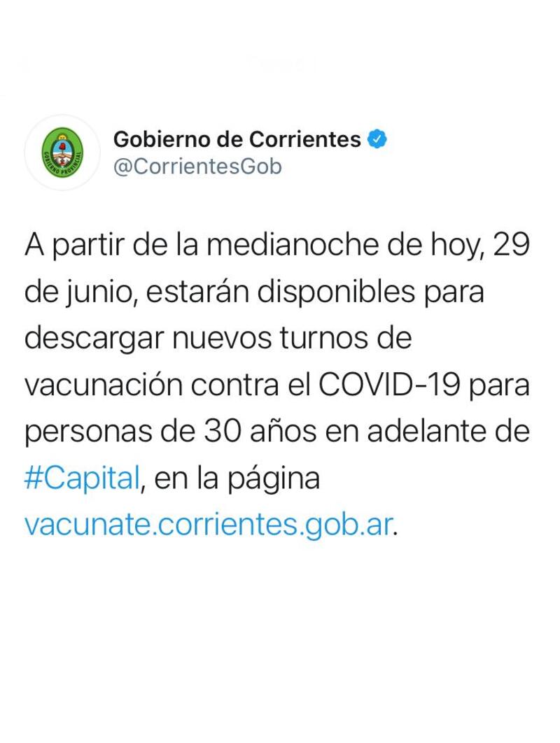 El Gobierno provincial anunció por medio de su Twitter oficial que “a partir de la medianoche de hoy, 29 de junio, estarán disponibles para descargar nuevos turnos de vacunación contra el COVID-19 para personas de 30 años en adelante de Capital”.
