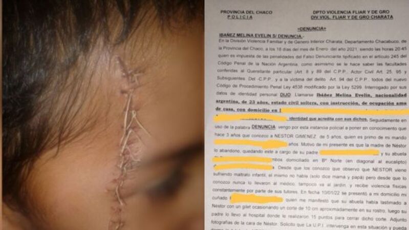 La muchacha, de 24 años, radicó la denuncia en el Departamento de Violencia Familiar y Género de Charata. Relató que conoce al niño desde hace tres años, pero un hecho la terminó horrorizando el 10 de enero pasado: el pequeño había terminado con un corte de 10 cm en la cara ocasionado por su abuela con una máquina de afeitar.