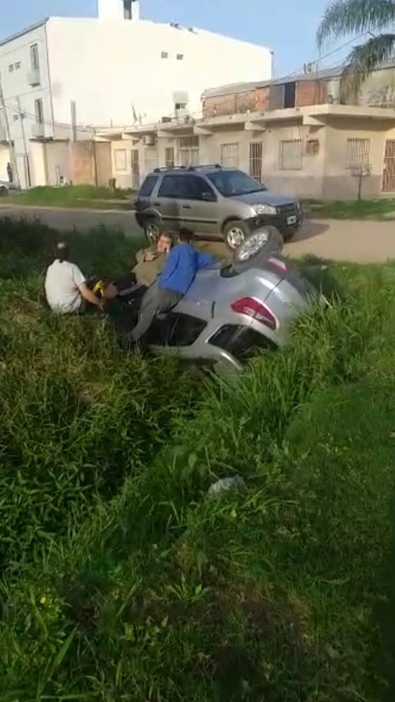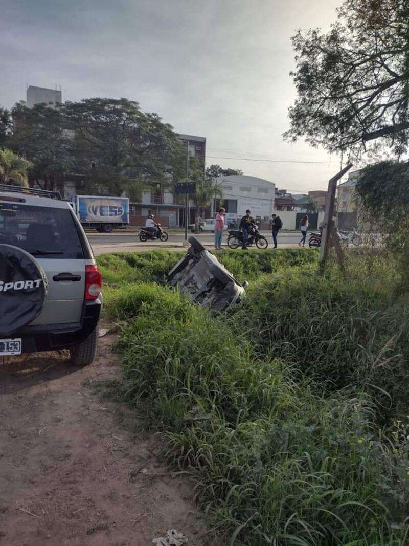 Una camioneta Ford Eco Sport terminó dentro de un zanjón en la intersección de calle Granville y Avenida Libertad, luego de esquivar a un ciclista.
