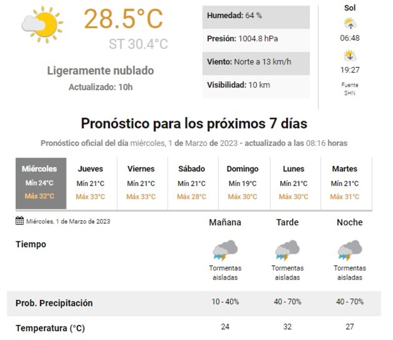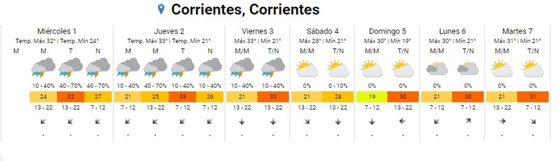 Desde el Servicio Meteorológico Nacional anuncian tormentas aisladas para éste Miércoles, Jueves y Viernes, se espera que la temperatura alcance los 32 °C el miércoles, con probabilidad de tormentas aisladas (10 – 40%) y viento suave del Noreste de entre 13 y 22 km/h.