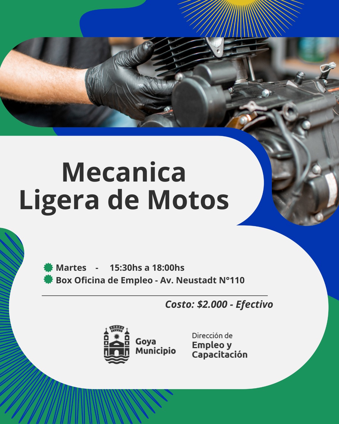 Mecánica ligera de motos: Es un curso cuyo objetivo es realizar mantenimiento y reparaciones de motos. Vas a poder identificar fallas y minimizar daños. Un curso ideal para quienes poseen conocimientos previos y quieren comenzar a incursionar en la mecánica. Inicia el martes 24 de 15,30 a 18 horas, en el box de Empleo, avenida Neustadt 110.