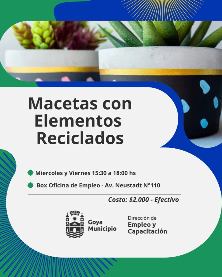 Macetas con elementos reciclados: Crear macetas con materiales reciclados es un curso práctico y sostenible. Puedes usar botellas de plástico, galones de cloro, cartón, papel o envases de alimentos como moldes para cemento, yeso o fibra de coco. Se aprende a mezclar, moldear, desmoldar y decorar piezas únicas, reduciendo la basura hogareña. Inicio: miércoles 25 (días de cursado miércoles y viernes), en box de Empleo.